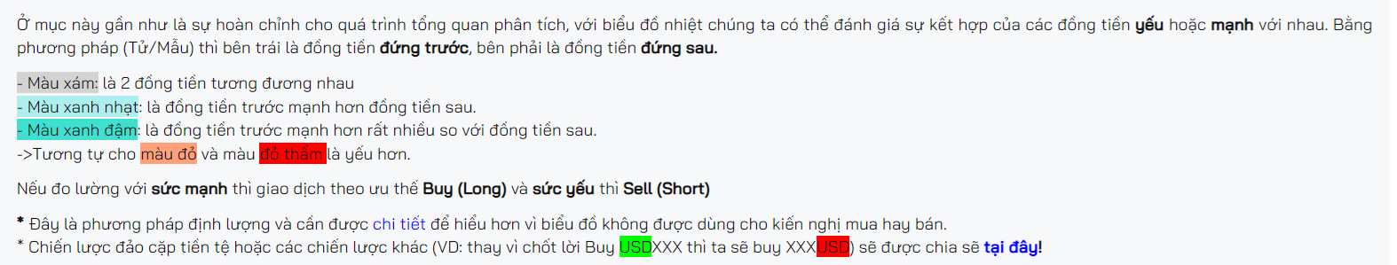 Đây là phương pháp đánh giá sức mạnh từng đồng tiền riêng lẻ, để đánh giá chi tiết nội tại tiền Quốc Gia đó tại và sau đó chọn cặp tiền tệ phù hợp kết hợp với nhau có độ biến thiên tốt nhất cho . Hãy chú ý đến màu đường giá của đồng tiền để đánh giá mức độ tăng giảm của đồng tiền đó.